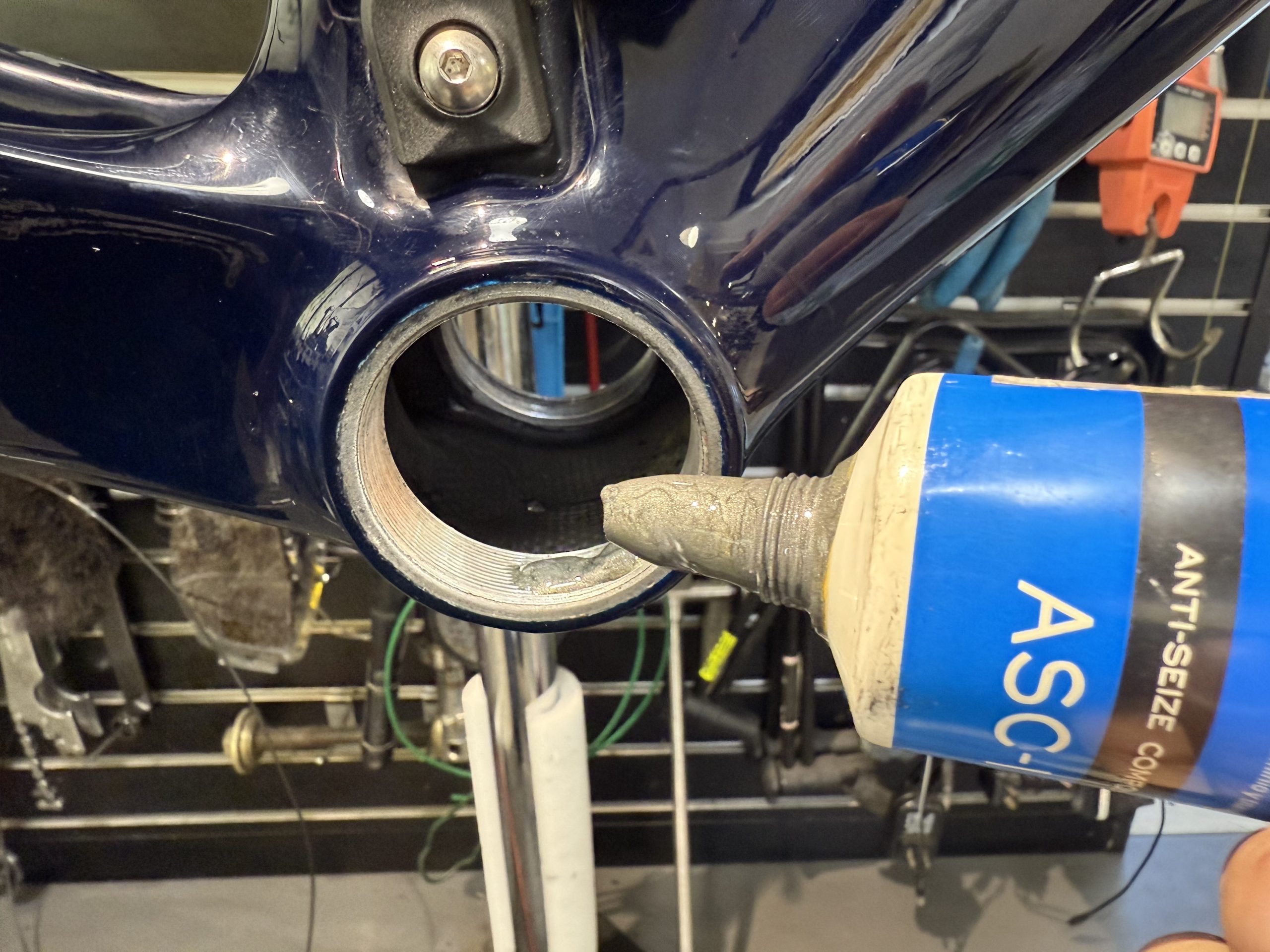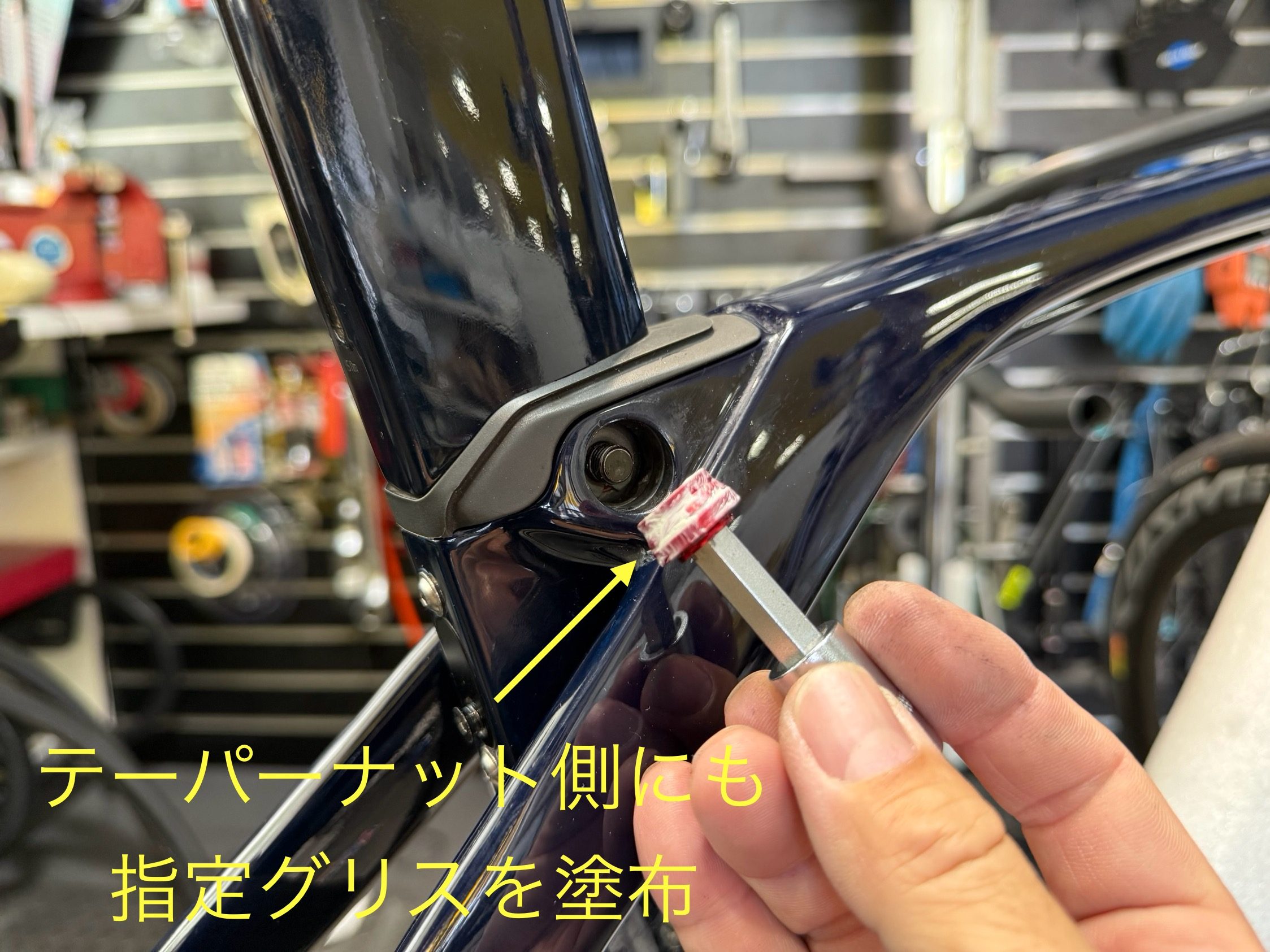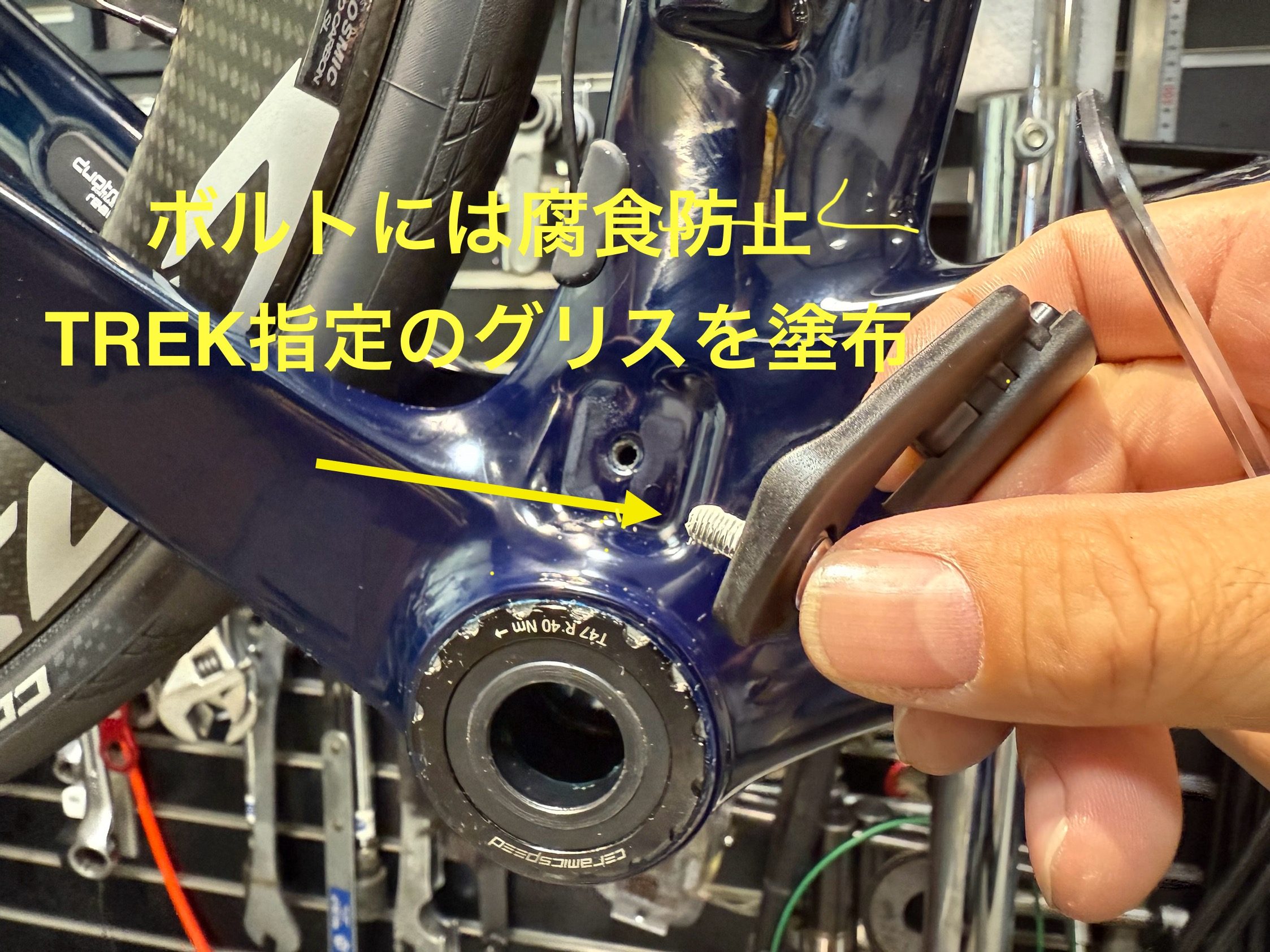 清掃したBBのスレッド部分に、異音、かじり付き防止のコンパウンドを塗布し取り付けます。
