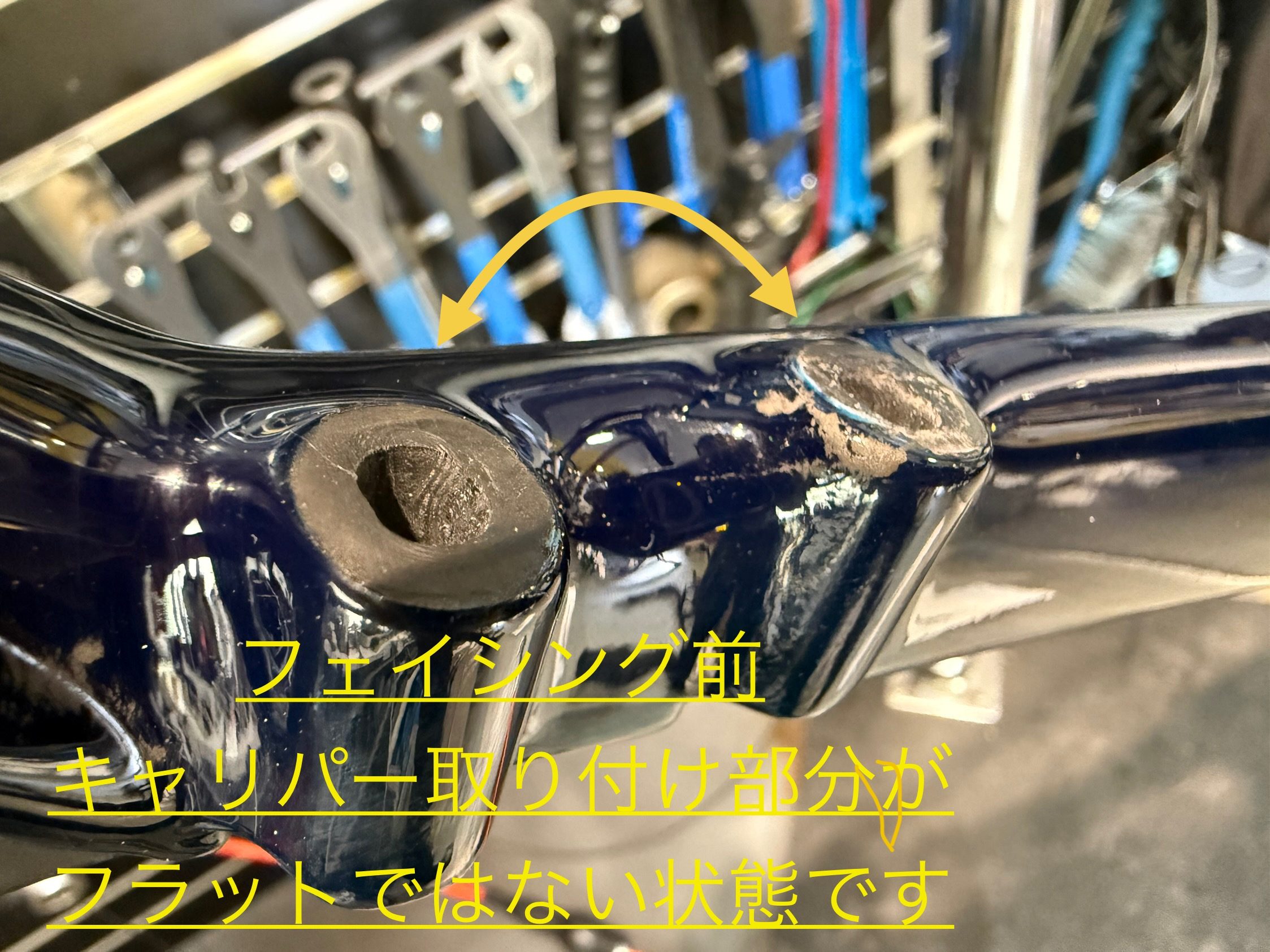 フロントブレーキを取り付ける、フォーク側も状態が良くなかったため、フェイシングを行いました。