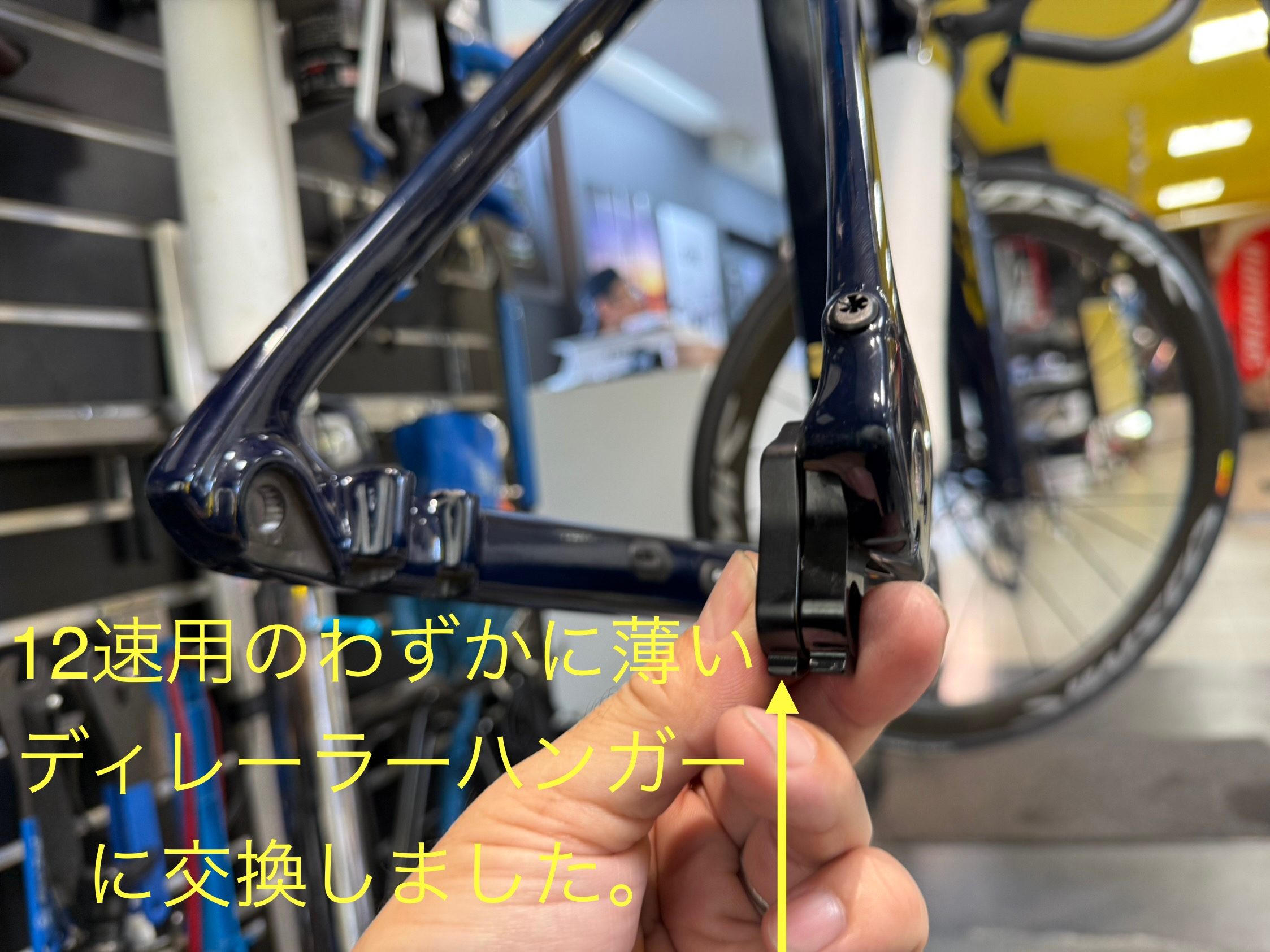 11速シフトまでの設計で作られていた旧型ディレーラーハンガーから、12速用の新しく設計されたディレーラーハンガーに交換します。