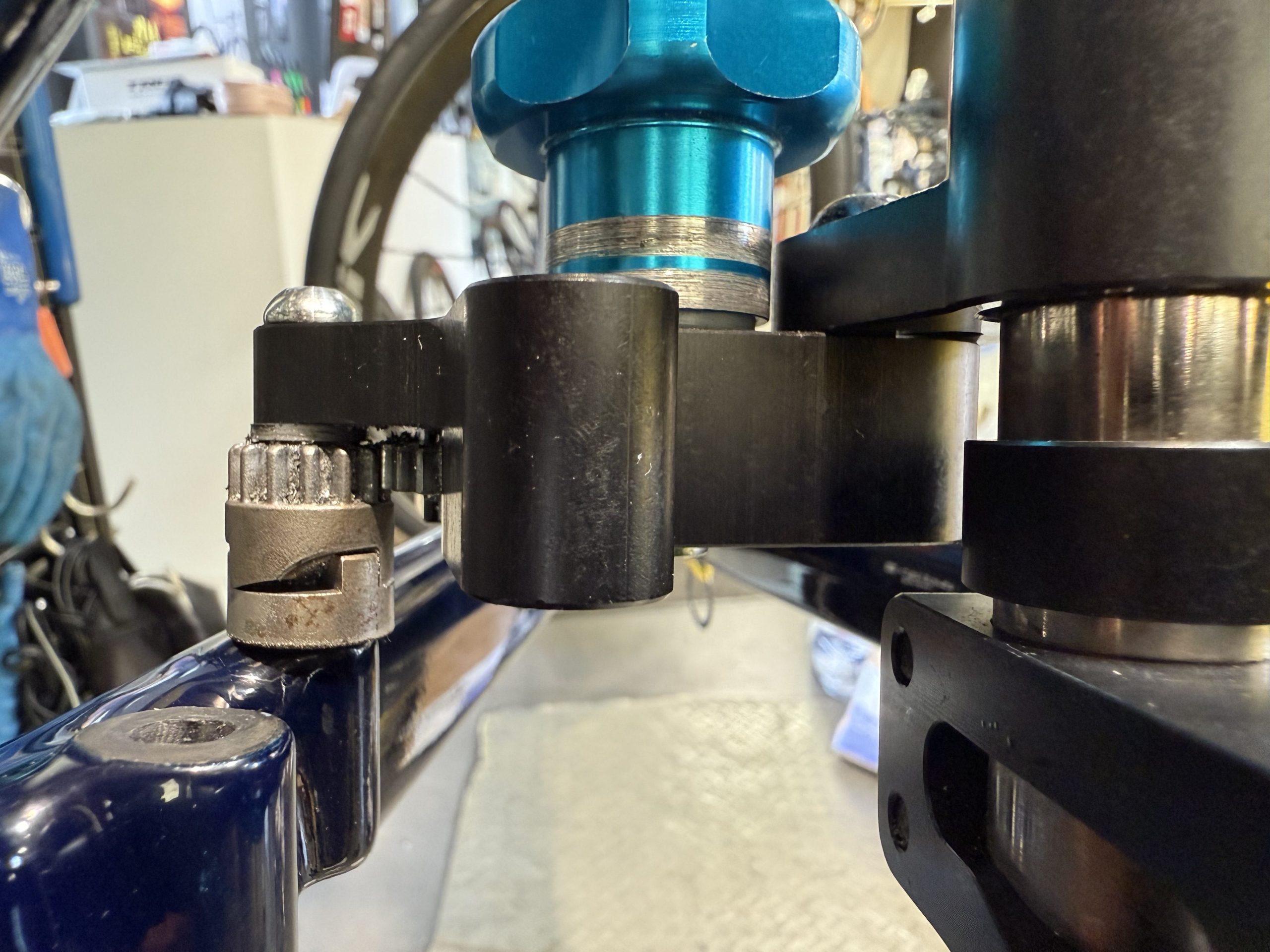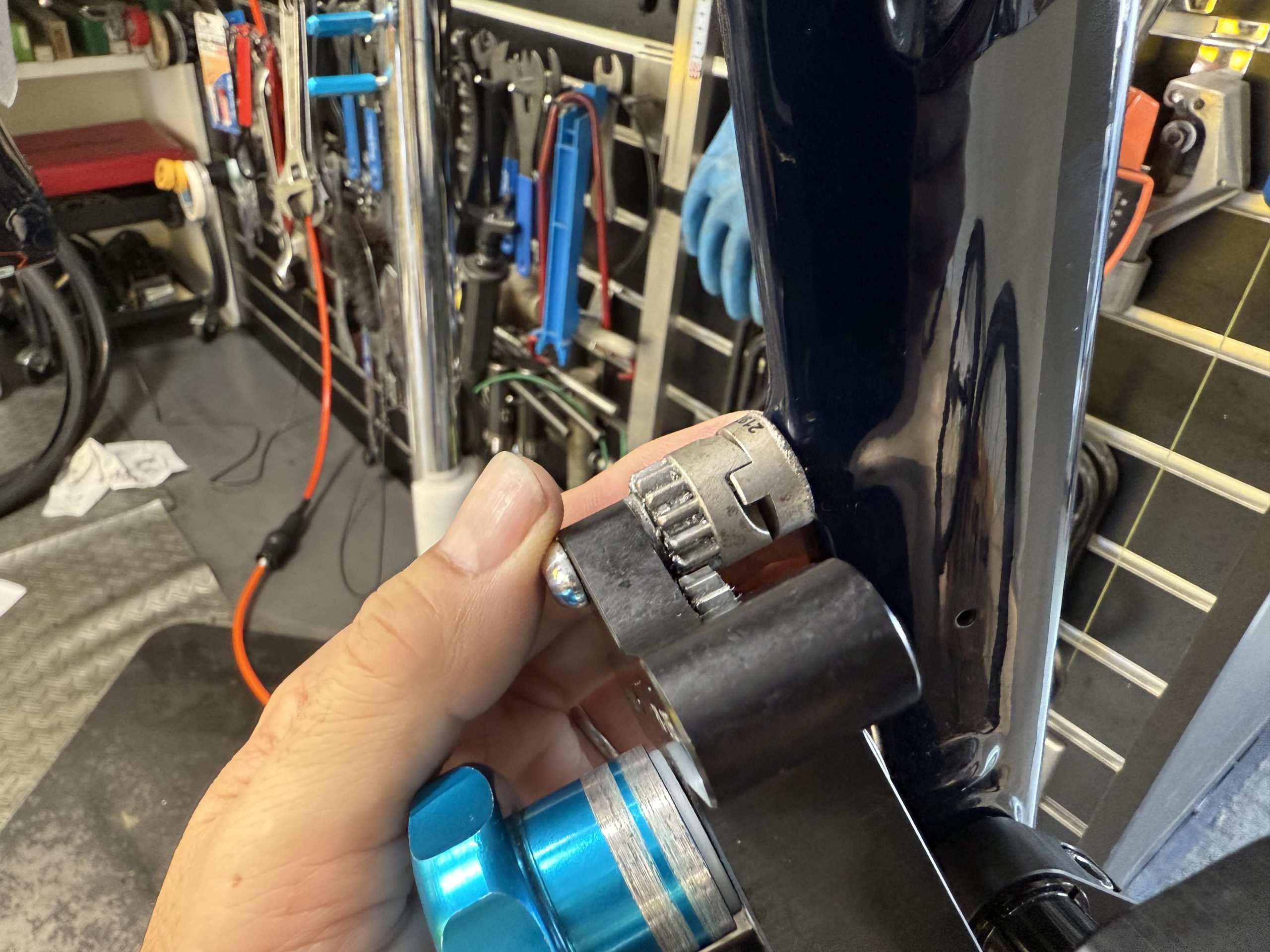 このボルトをガタがあるからと、指定トルク以上で増し締めして使い続けると、ブッシュがなくなるほど削れ最終的にカーボンフレームを痛めてしまいます。