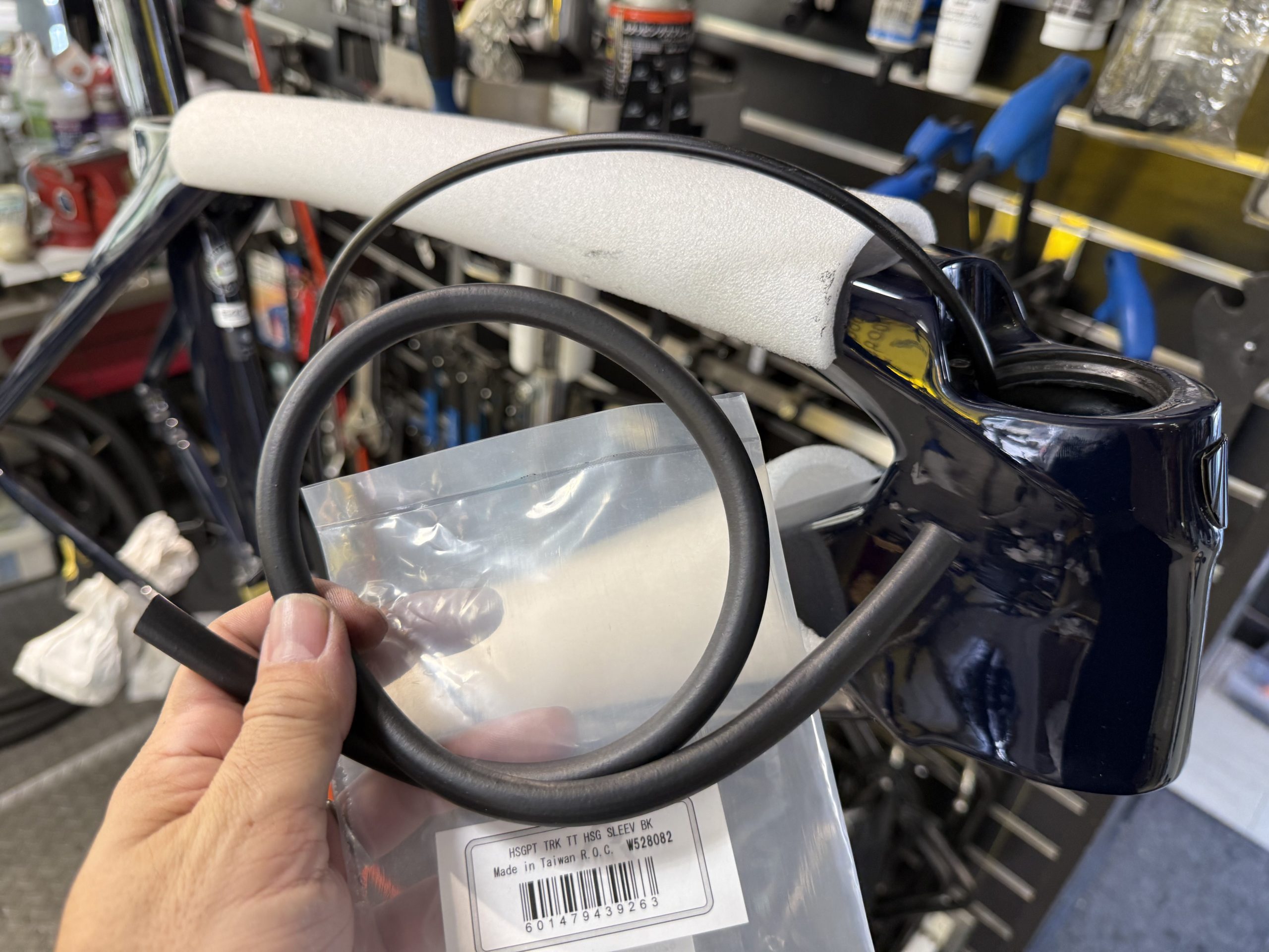 ブレーキホースはフレーム内部での異音防止に、フォームスリーブを被せました。
